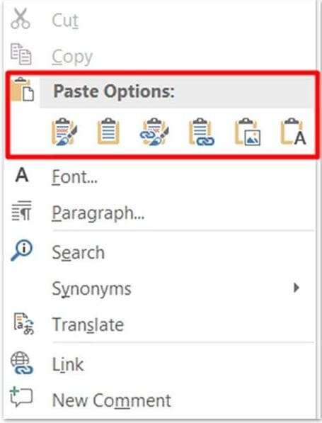 2. Buka MS Word kamu, kemudian klik kanan pada area yang ingin di paste. Perhatikan menu Paste Options: di sana akan ada banyak pilihan bentuk paste.